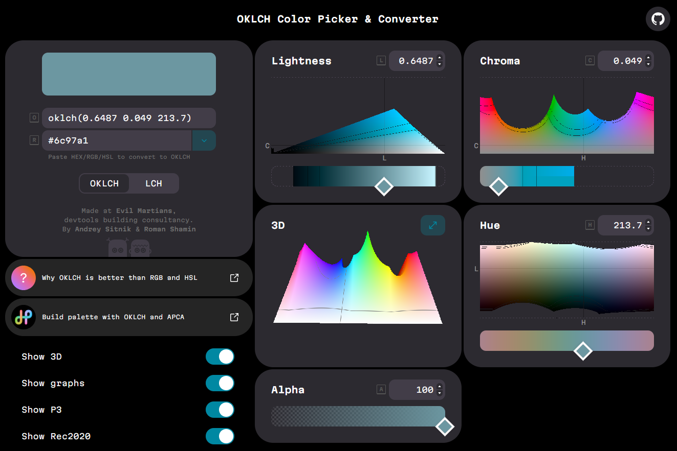 Is a mathematically perfect rainbow colour palette impossible? Enter OKLCH; the only colour space bold enough to expose colour vision for what it truly is, a fucked up dream caused by miniscule differences in electromagnetic radiation. I've always had a passion for colours, it's what drew me to art in the first place, and I love defining a colour palette, or lining up my pens in aesthetically pleasing orders, so when I first discovered this system it was like the heavens parting. This colour system shone celestial light down upon me and I realised everything that was wrong with my life could simply be explained by the differences in human colour perception and computer colour display. I have to wax poetic because as soon as I show you the model, you will get scared.